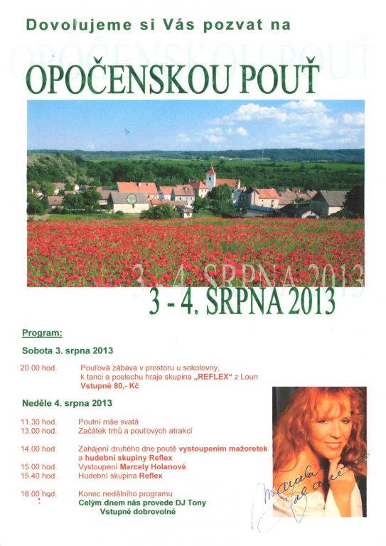 V sobotu 3.8.2013 byla ve 20.00 hod. zahájena letní pouť v Opočně taneční zábavou. Na novém venkovním podiu se představila hudební skupina REFLEX z Loun. I přes velkou nepřízeň počasí předvedli pro 150 návštěvníků perfektní výkon, především vedoucí skupiny Čenda Spousta a kytarista-zpěvák Zdeněk Gajdůšek. V neděli dopoledne proběhla poutní mše svatá, v kostele Nanebevzetí Panny Marie.Odpoledné pokračovala pouť atrakcemi kolotočů a trhových stánků. Hudební skupina REFLEX ve 14.00 hod.pokračovala v zábavě a celého nedělního programu se kvalitně ujal moderátor DJ Tony, který představil jako hosty, šest přeživších dětí z Lidic, v čele s předsedou ZO ČSBS Lidice, panem Pavlem Horešovským, dále ředitele PLJUDr.M.Červencla s manželkou MUDr.D.Červenclovou a až z Plzně k nám přijela paní Silvie Klánová (dcera akademické sochařky Marie Uchytilové) s manželem.Během programu bylo i představení dobrovolných budovatelů venkovního podia a jeho pokřtění váženou zpěvačkou, Marcelou Holanovou. Pásku přestřihla společně se starostou Václavem Fymanem a všichni křest ukončili slavnostním přípitkem. Ze sousedníchTouchovic přijeli na krásném dobovém dvoukole Radek Ložan a jeho bratr Vláďa s přátelským poselstvím a pozvánkou na pouťovou akci v Touchovicích, která se koná za týden ve dnech 10-11.8.2013. Dvoukolo slavnostně předali V.Fymanovi, ten přislíbil, že za týden z Opočna přijedou a návštěvu oplatí. Během odpoledního programu nás provázela skupina " Postoloprtské mažoretky", pod vedením Lenky Kindlové a Evy Loosové (obě mistryně ČR z roku 2000). Mažoretky patří k jedněm z nejlepších v ČR a v Opočně to potvrdily a sklidily obrovský aplaus. Vrcholem letní poutě byla již zmiňovaná zpěvačka Marcela Holanová, ktará se nezalekla zhoršujícího se počasí a svým hlasovým fondem potvrdila jaký je pěvecký formát. Myslím, že hodně posluchačů na její pěvecký přednes dlouho nezapomenou. Nedělní pouť, i přes nepřízeň počasí se zdařila a velký počet návštěvníků svým potleskem dal najevo svou spokojenost. Závěrem chci ještě zvlášť poděkovat řediteli PL JUDr.M.Červenclovi za jeho podporu a přízeň k Opočnu.